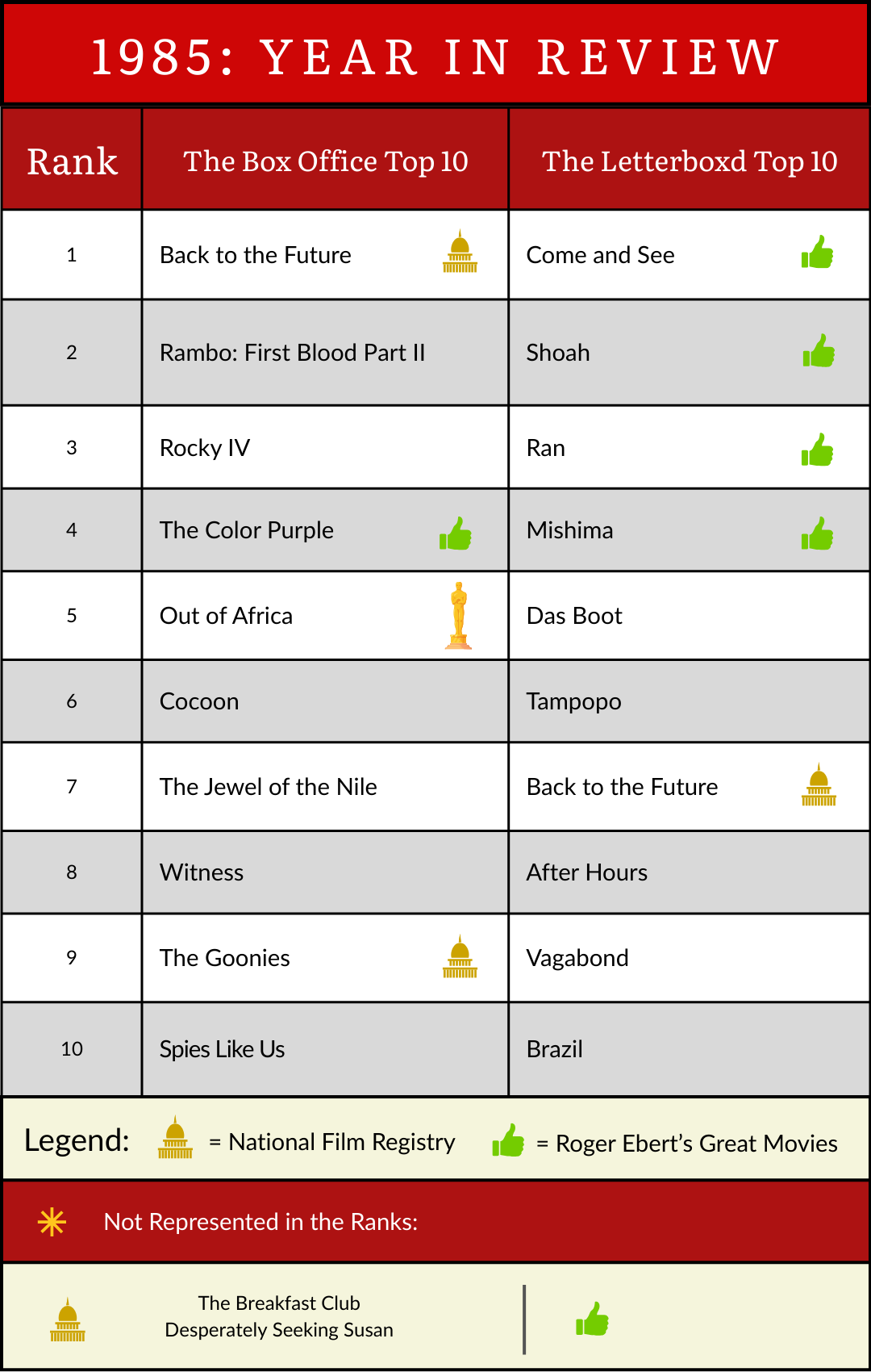 Notably, Back to the Future is the only film to land in both the Box Office Top 10 and the Letterboxd Top 10 for the year. Alongside The Goonies, it remains perhaps the most fondly remembered film of ‘85, still a staple of repertory theaters and outdoor movie nights nationwide.
